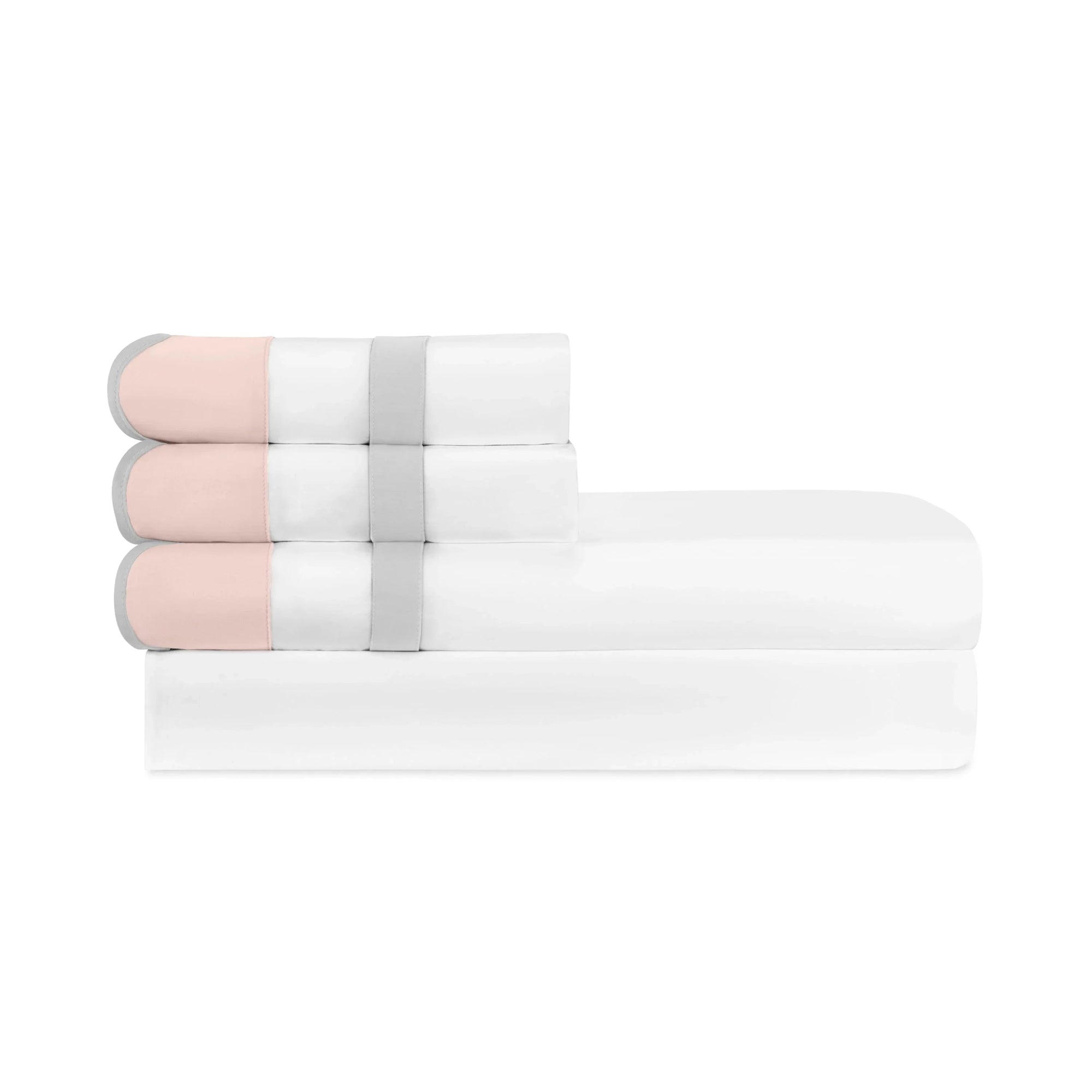 Les draps plats Portofino sont conçus avec une base en satin blanc naturel solide, avec un insert en satin contrastant de 1,5' et un feston assorti, avec une couleur secondaire sur le revers.
